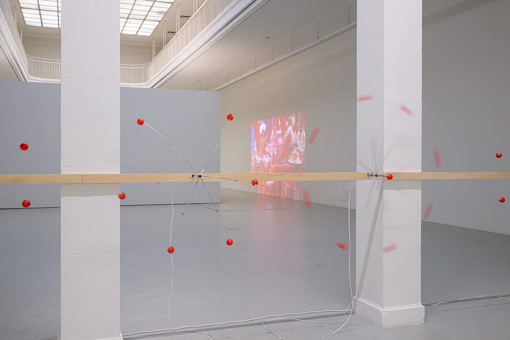 Red dots, red noses, red noses, red dots, 2024 . Installation, wood, cables, junction box, ball bearings, motors, umbrellas, steel wire, plastic clown noses, sound of mechanisms, 162 × 440 × 73 cm (adaptable dimensions)