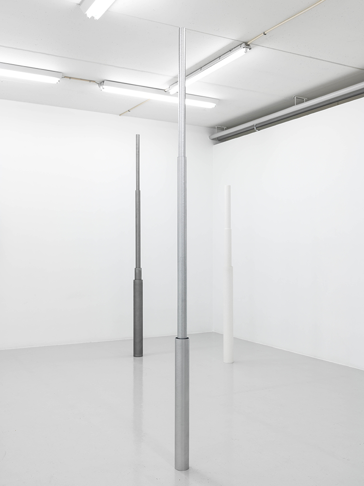 Untitled (spyglasses), 2019 . Cardboard tubes, paints (steel spray, chrome spray, bright white alkyd) . From ø 10 to ø 12 cm x from 200 to 270 cm, 2019 . Photos, Okan Yildirim