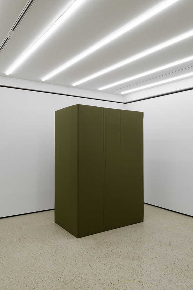 Neutral box, 2024 . Cardboard, green extra matt acrylic paint . 198 x 135 x 87 cm
