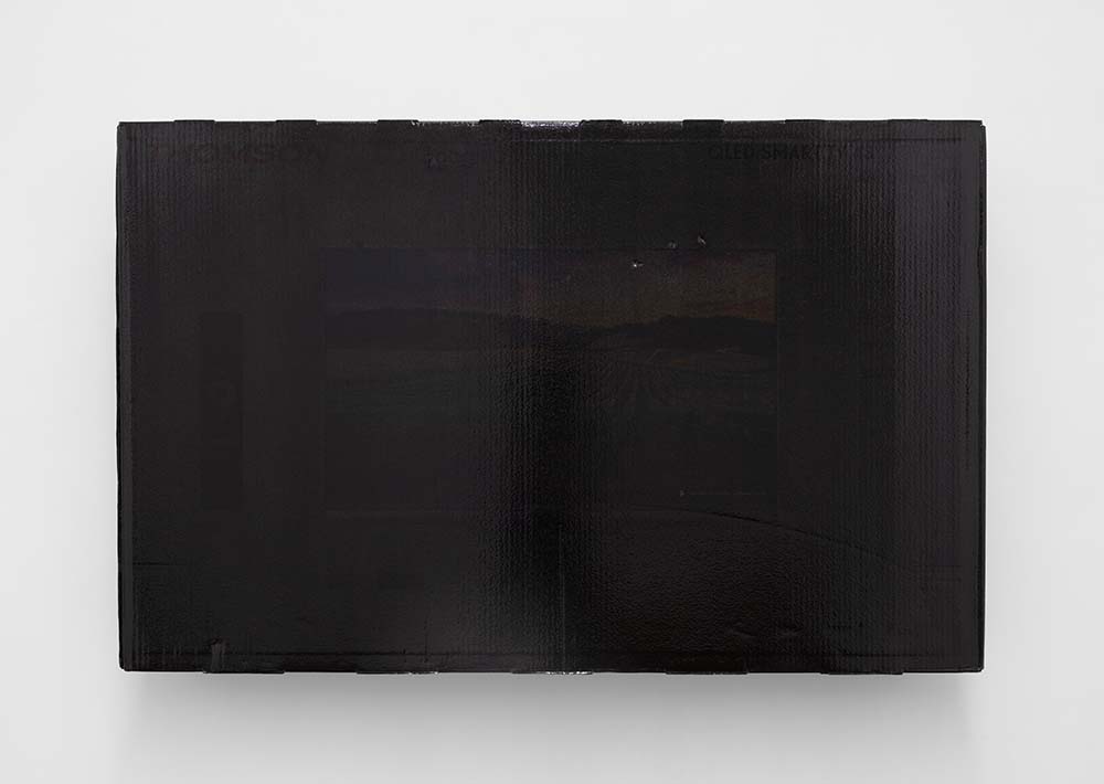 Black screens (Thomson 43 landscape), 2025 . Flat screen TV cardboard packaging, black dye, gloss varnish . 67.5 x 105 x 16.5 cm