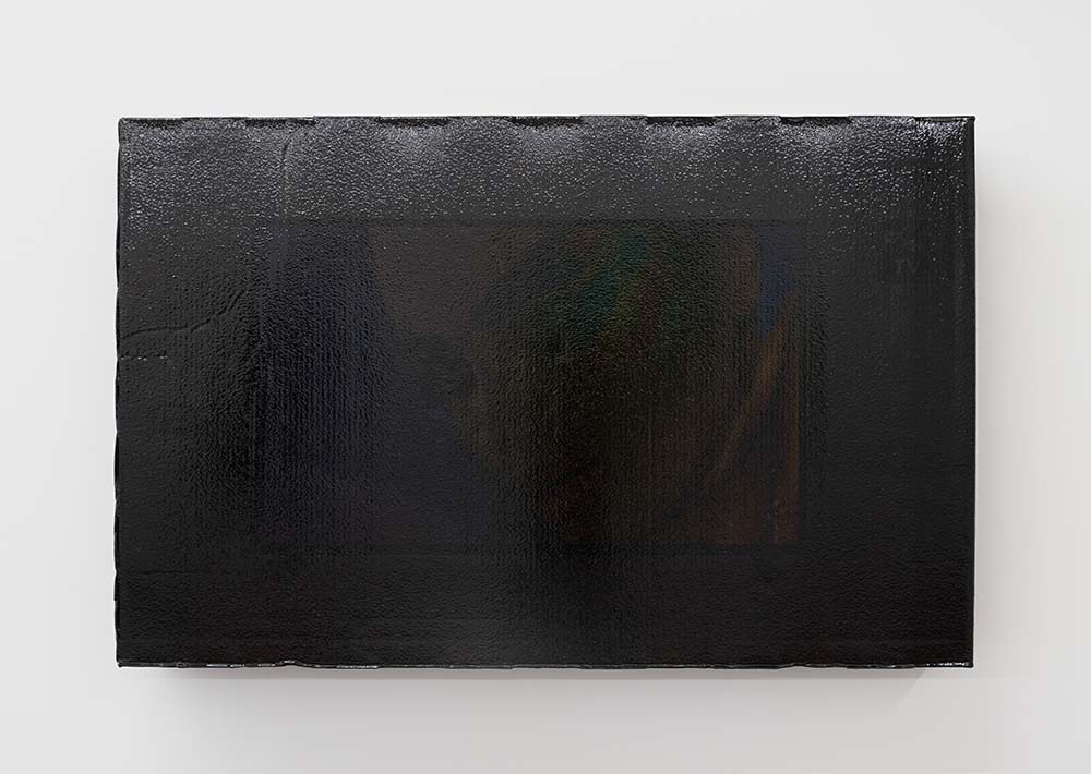 Black screens, 1/5, 2023 . Flat screen TV cardboard packaging, black dye, gloss varnish, 88 x 139 x 16 cm