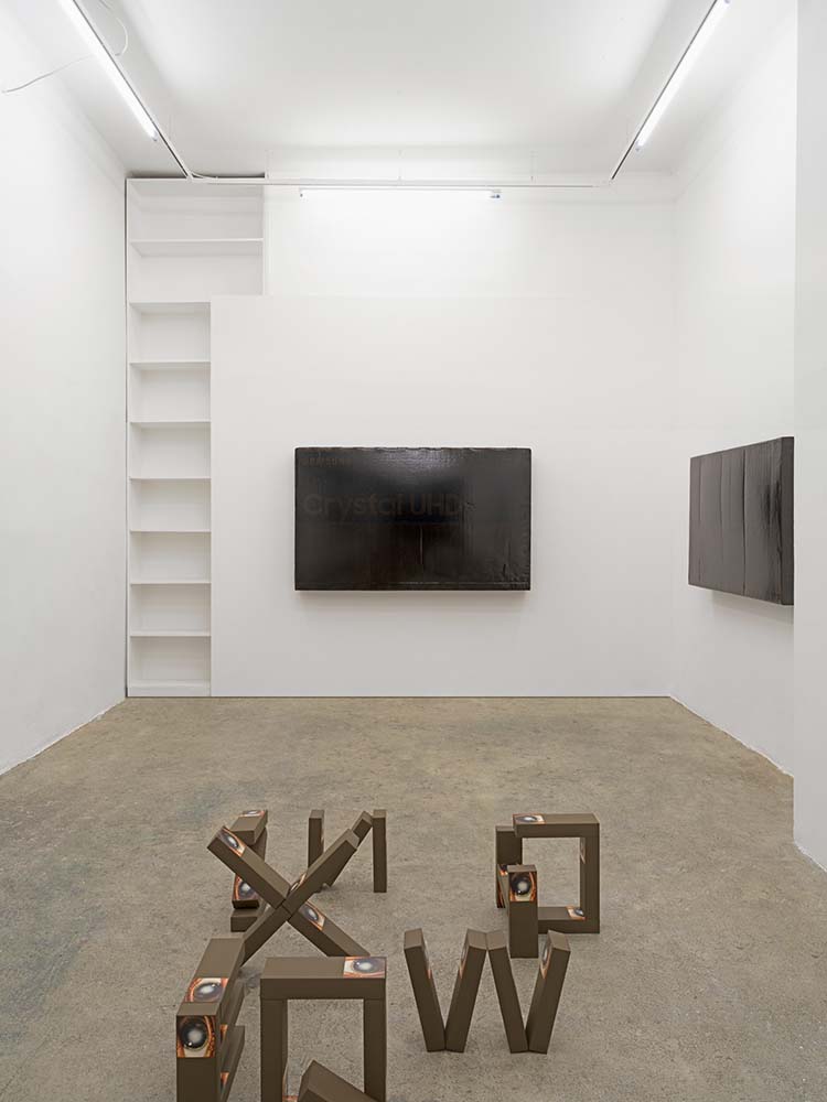 Black screens, 5/5, 2023 . Flat screen TV cardboard packaging, black dye, gloss varnish, 85 x 150 x 17 cm